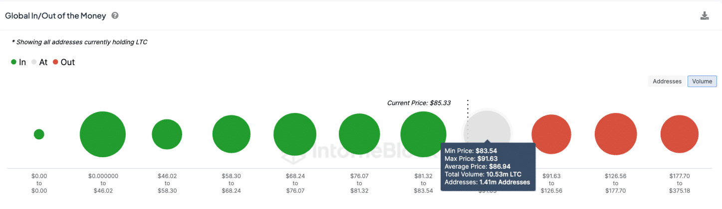 If we look at the price of Litecoin, IntoTheBlock analysts said that more than 1.4 million addresses purchased 10.53 million LTC at a maximum price of $91.6.