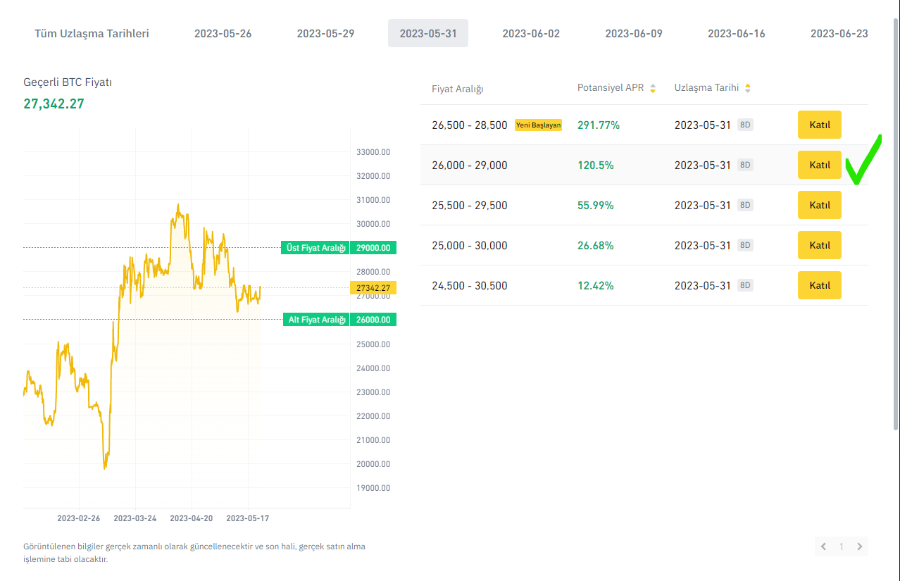 On the Binance Range Bound page, I mark 31.05.2023 from the settlement dates and find the price range I want and press the join button.