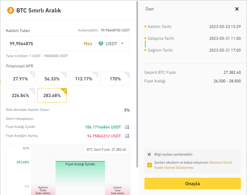 If Bitcoin price moves between $26,000 and $29,000 by 11:00 on May 31, 2023, I will receive $102.5 (Participation + APR), if it exceeds this price range or touches $26,000 or $29,000, I will not receive any rewards. and the $100 I deposited as the participation amount, I will get back as $95.