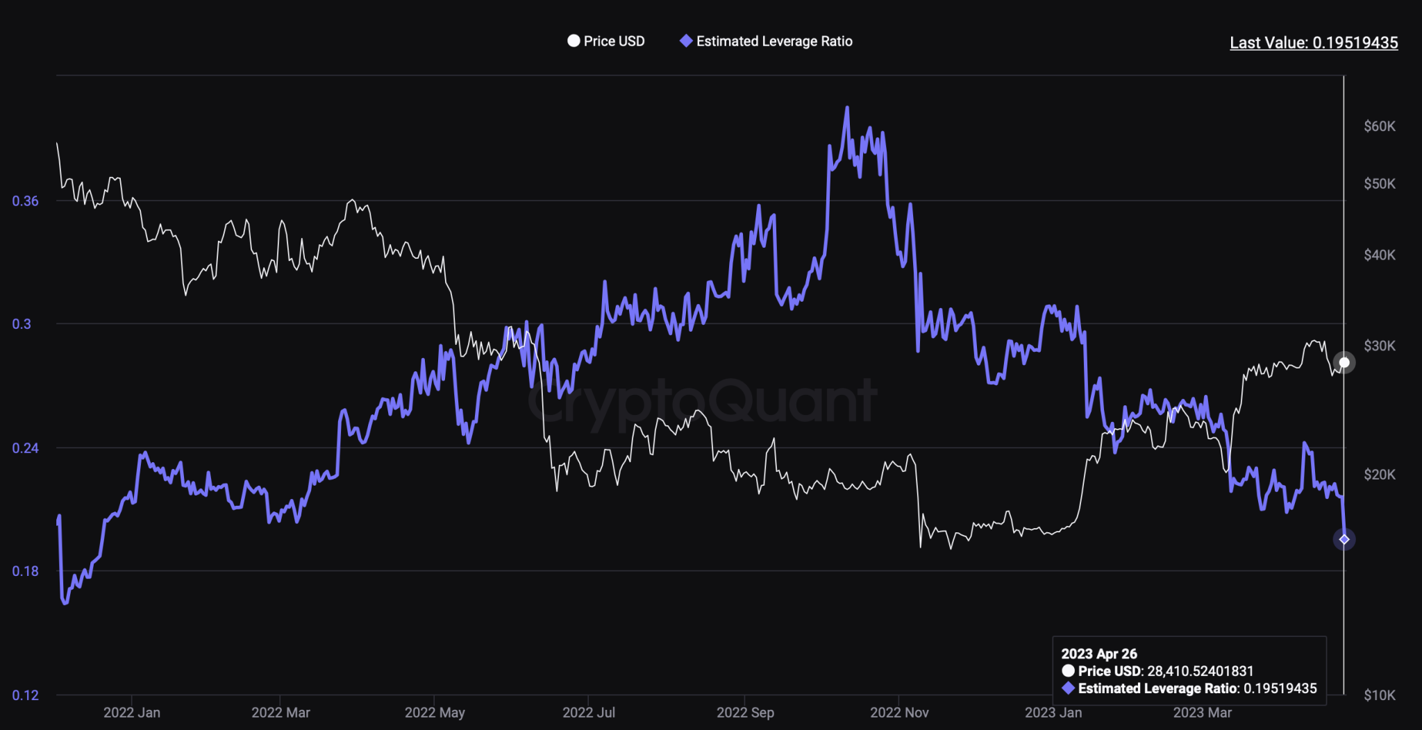 “Estimated leverage in Bitcoin fell to 0.195 on Wednesday, reaching the lowest level since December 20, 2021.