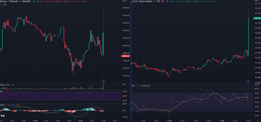 After the incoming data, the reaction of Bitcoin and the dollar index is as follows: