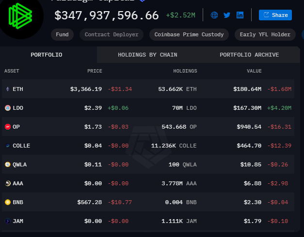 According to Arkham data, Paradigm Capital has 53,662K ETH worth $180 million, while there are various altcoins other than ETH, such as LDO, OP, COLLE and BNB.