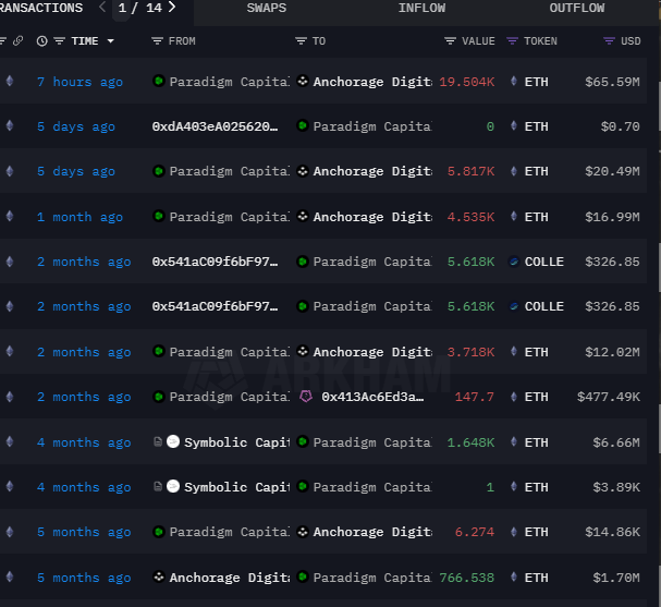 According to data from popular blockchain and analytics firm Arkham Intelligence, Paradigm Capital deposited 19,504 ETH worth approximately $65.59 million into institutional-grade custody platform Anchorage Digital.