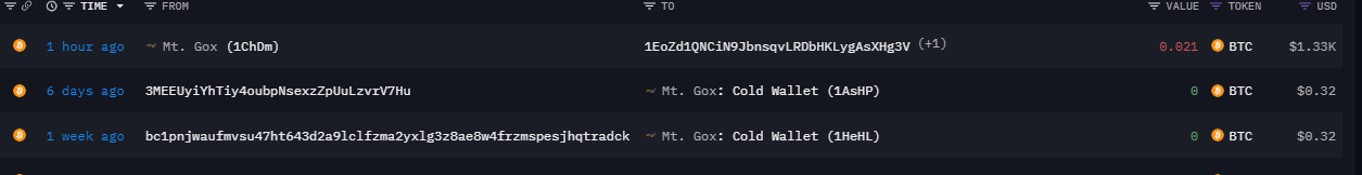According to Arkham data, bankrupt cryptocurrency exchange Mt. Gox transferred 0.021 Bitcoin to unknown wallet address.