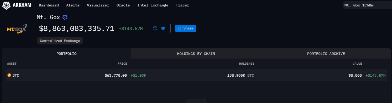 According to the data, Mt. Gox wallet currently holds 138,985k Bitcoins worth $8.8 billion.