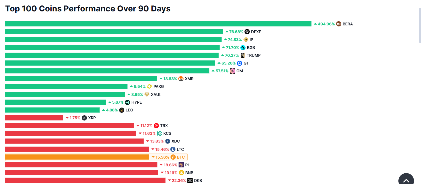 “1-Berachain (BERA): +494% 2-DEXE: +76% 3- Story (IP): +74% 4- Bitget Token (BGB): +71% 5- TRUMP: +70% 6-Gate Token (GT): +65% 7- Mantra (OM): + 57% 8- Monero (XMR): +18%, 9-PAXG: +9.5% 10-XAUt: +8.9% 11-Hyperliquid (HYPE): +5.6% 12-UNUS SED LEO (LEO): +4.8% 13- Ripple (XRP): -1.7% 14-Tron (TRX): -11% 15-Kucoin Token (KCS): -11.6% 16-XDC Network (XDC): -13.8% 17-Litecoin (LTC): -%15.4”