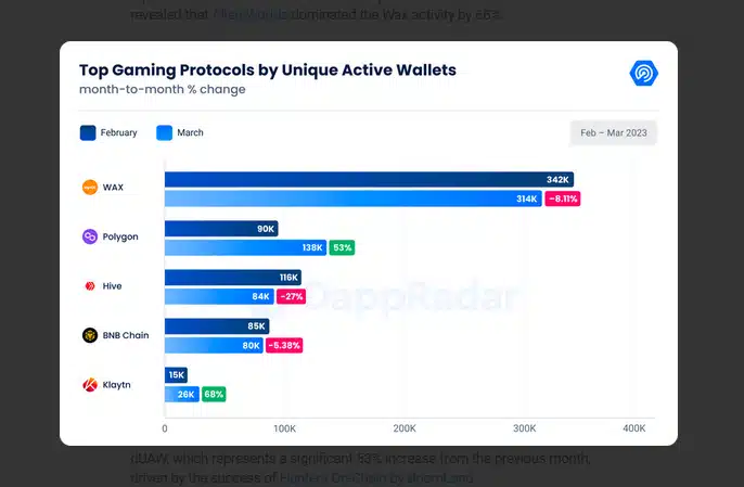 DAppRadar, which monitors and analyzes decentralized applications, recently published a research report. Statistics compiled by the blockchain follower revealed that the number of wallets dealing with games on the Polygon network increased by 53% throughout March, reaching a total of 138,000.