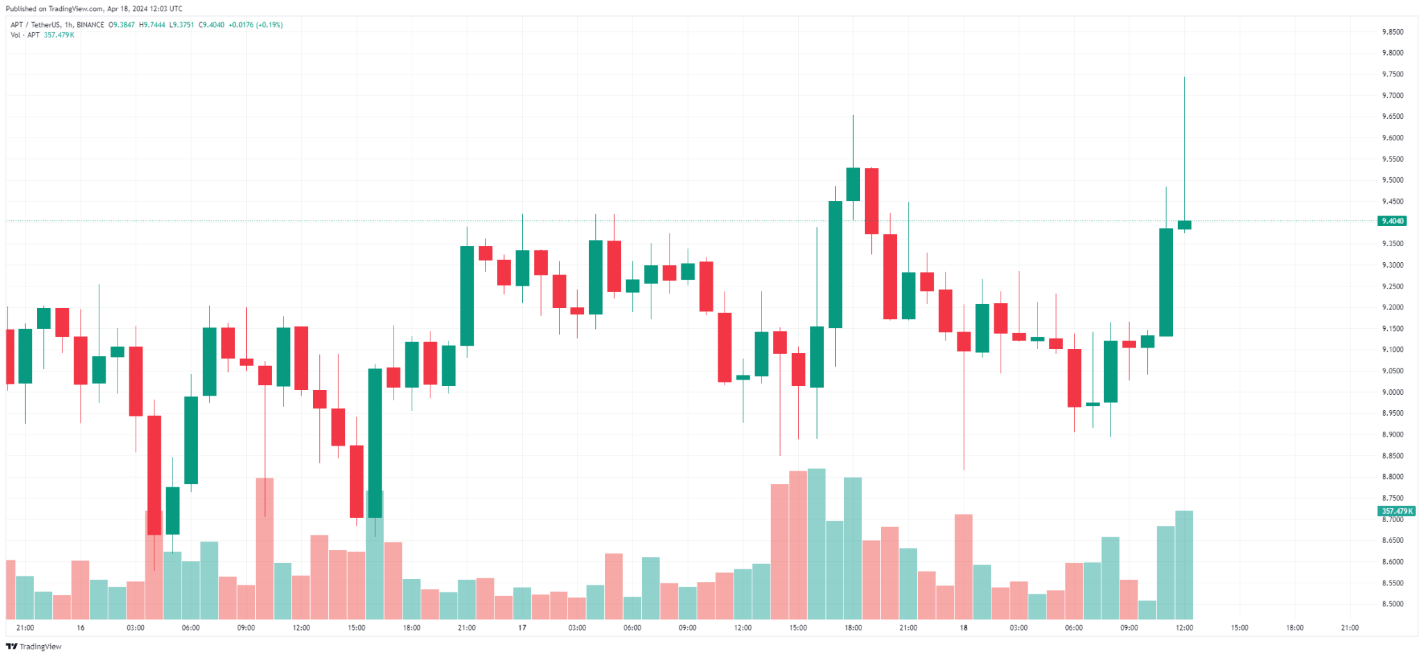 Following the news, Aptos experienced a jump and rose to $9.74, but later gave back these gains. APT continues to trade at $9.35 at the time of writing.