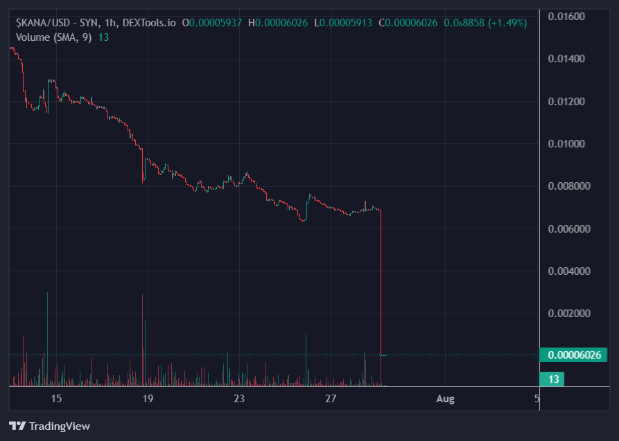 However, the audit failed to prevent Kannagi Finance from committing rug pull scams against its investors. According to Etherscan, the protocol drained the liquidity pools and transferred the funds to an unknown address. The KANA token price has lost 99% of its value, dropping from around $0.0070 to $0.000006026 at the time of this writing.