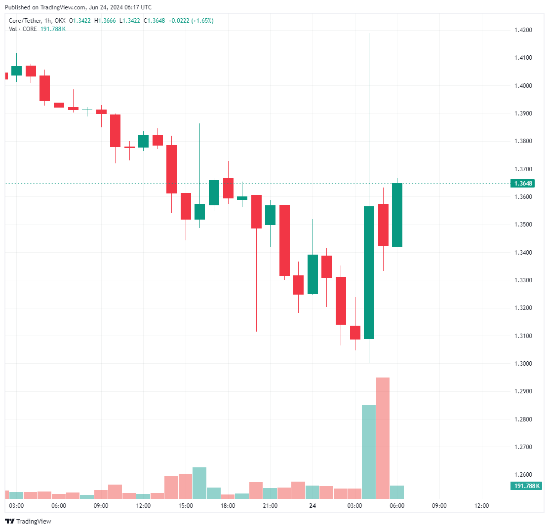 Following the listing news, the CORE price increased by more than 8%. However, due to the bearish trend in Bitcoin and the overall market, the CORE price gave back the majority of its gains.