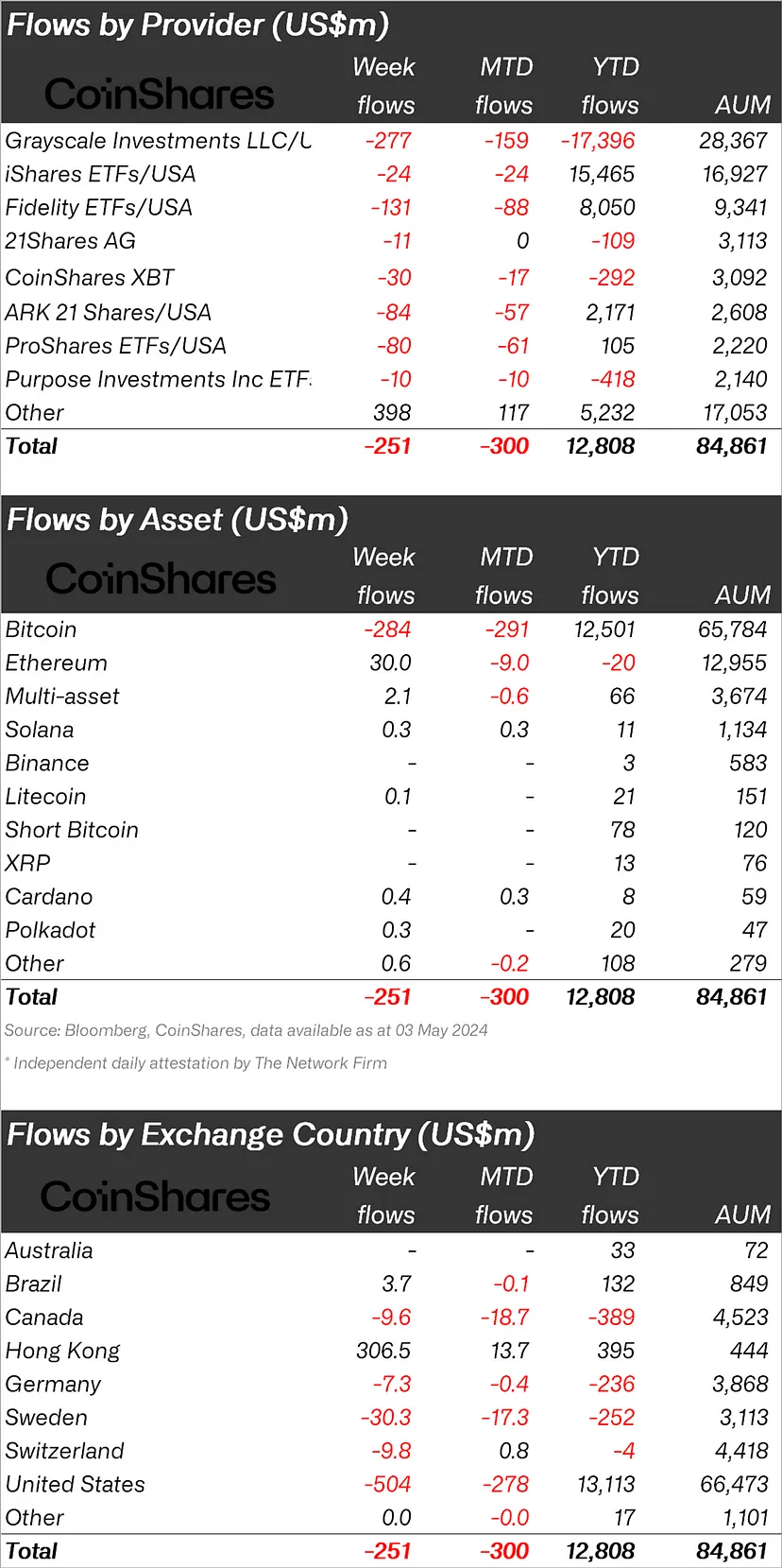“Cryptocurrency investment products saw outflows totaling $251 million for the fourth week in a row. These global outflows dwarf the $307 million inflows into Hong Kong ETFs.”