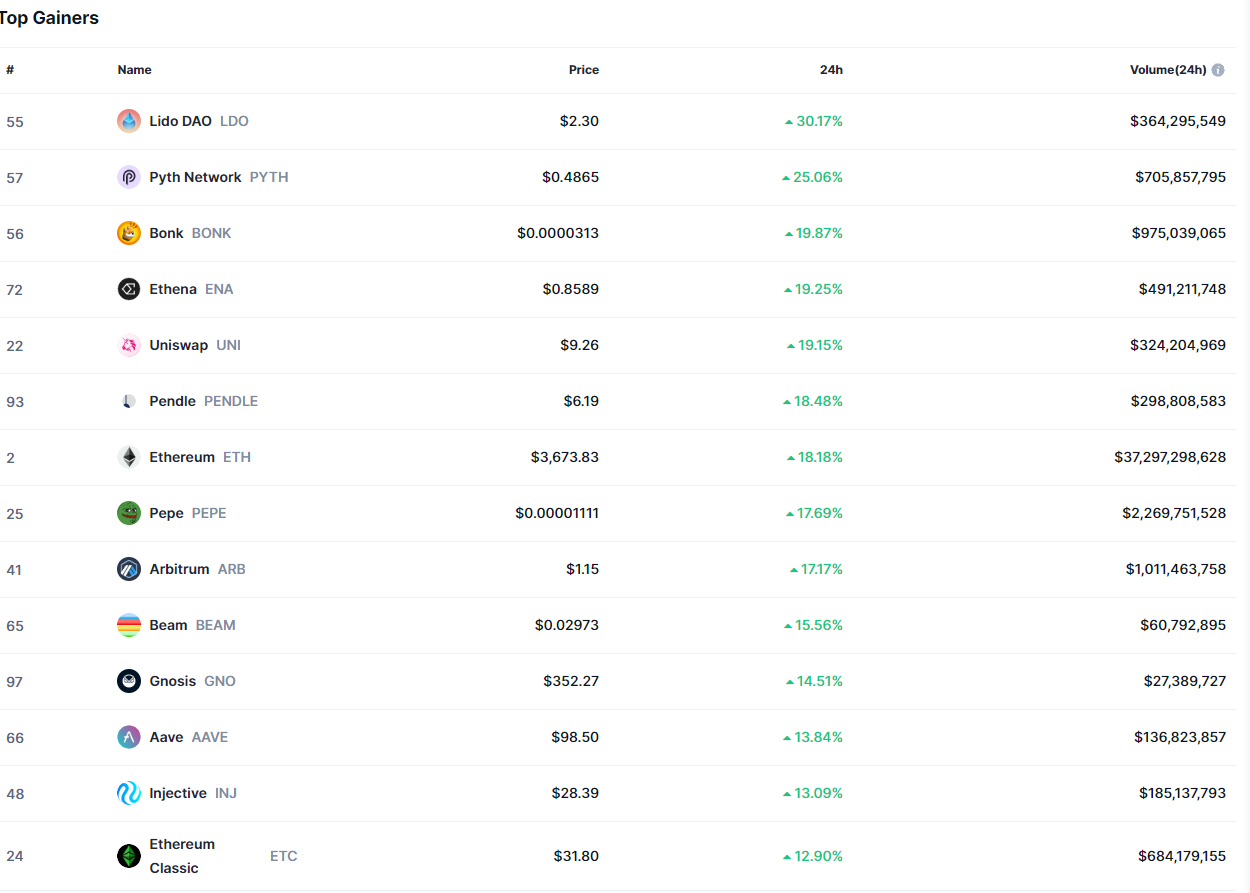 Ethena (ENA) 19.25%; Pendle (PENDLE) 18.4%; Arbitrum (ARB) 17.17%; Ethereum Classic (ETC) increased by 12.9%.