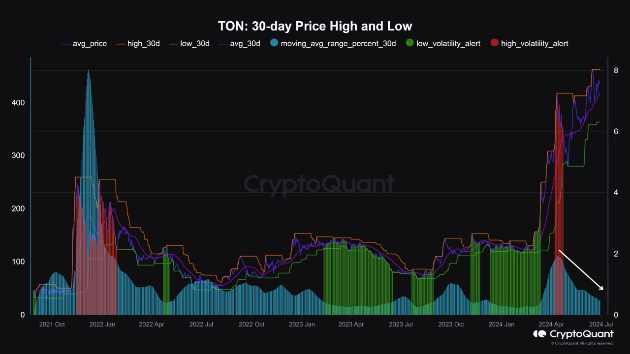 In a recent statement, an analyst from renowned cryptocurrency analysis firm CryptoQuant issued a “Low Volatility Alert” for Toncoin (TON). The analyst predicts that TON, which is currently trading near its all-time high, is about to experience a significant change in price volatility.