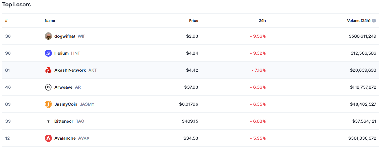 Again, according to Coinmarketcap data, the biggest losers in the last 24 hours were listed as follows: Akash Network (AKT) ranked 3rd with a loss of 7.1%, Helium (HNT) ranked 2nd with a loss of 9.3% and ranked 1st with a loss of 9%. Dogwifhat (WIF) has 5 losses.