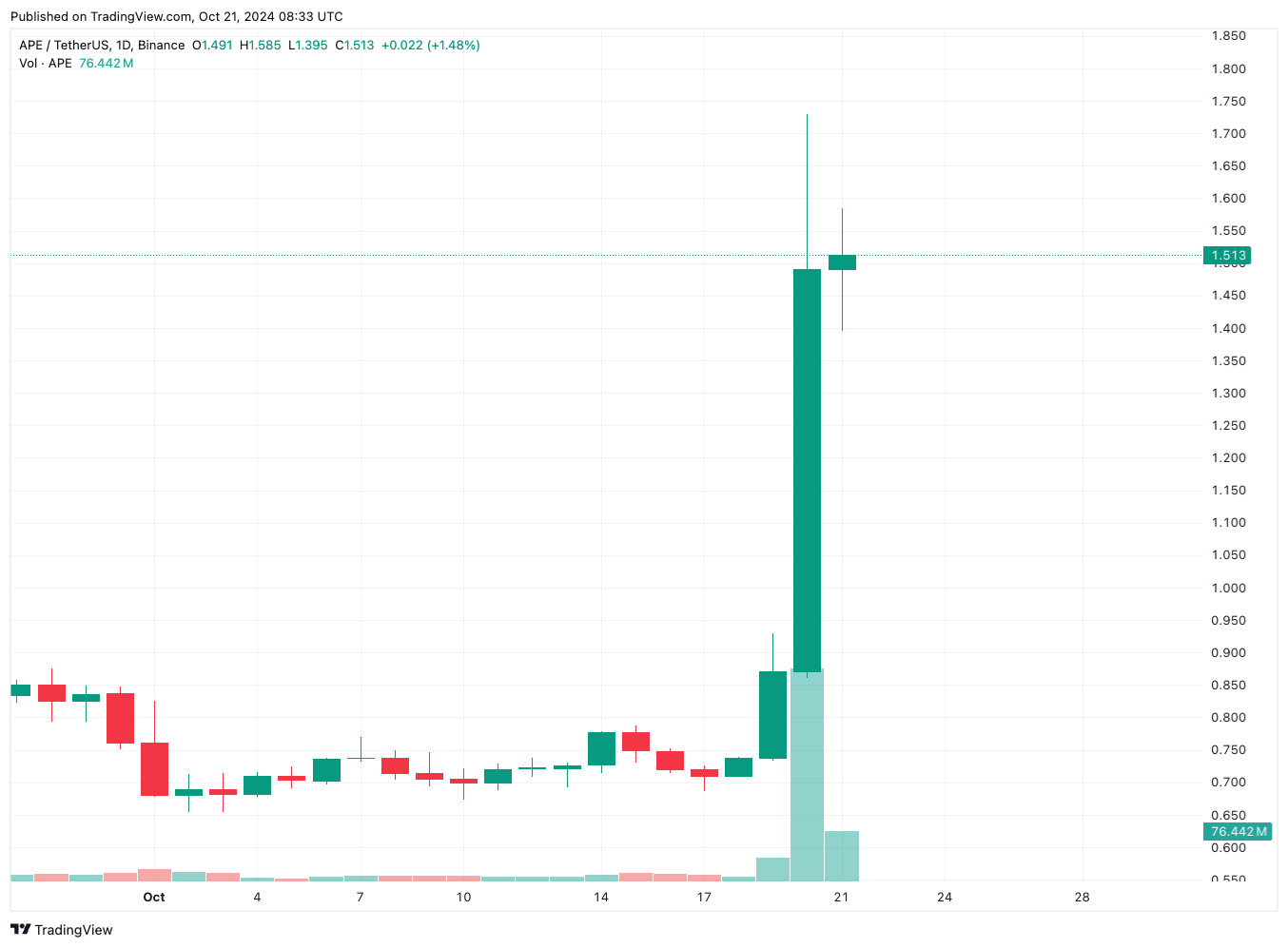 ApeCoin (APE) experienced a major surge over the weekend as staking returns arrived, doubling in value to surpass $1.5 for the first time since April.