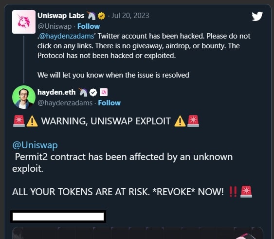 The Twitter account of Hayden Adams, the founder of decentralized cryptocurrency exchange Uniswap (UNI), has been hacked by fraudsters.
