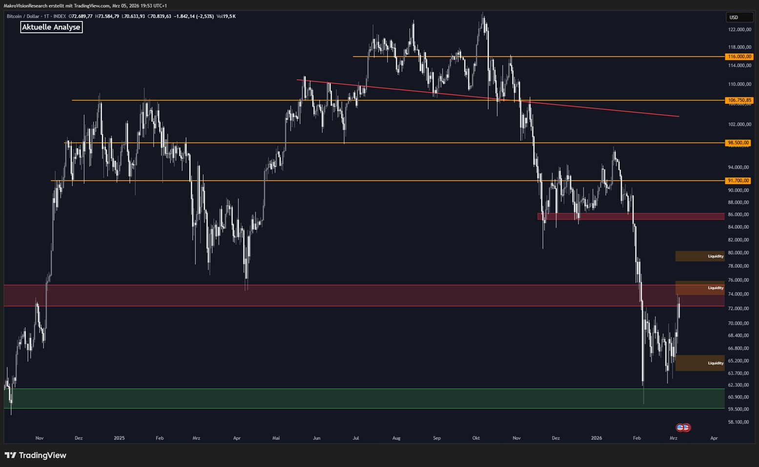 According to MacroVision, the Bitcoin price is currently trading just below a strong resistance zone between $72,500 and $75,000. Analysts state that this level is the most critical area that will determine the market’s direction in the short term. It has been noted that Bitcoin is attempting to break through this zone and is trying a new breakout.