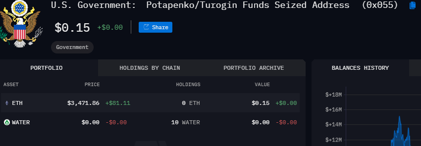 The address contains seized funds from Estonian crypto entrepreneurs Potapenko and Turogin. Previously, another US government address used to hold the seized funds transferred 11.84 BTC to 3KHnTq…muuso9.
