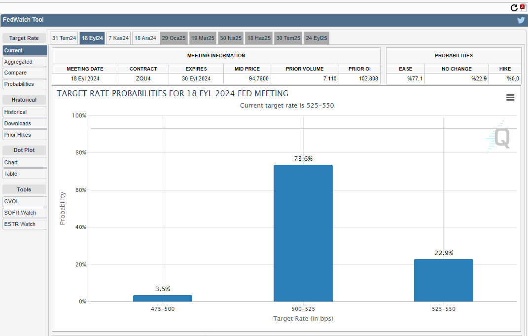 At this point, according to FED Watch, the probability of interest rates remaining constant in July is priced at 95.3%, while a 25 basis point reduction in the meeting on September 18 is priced at 73.6%.