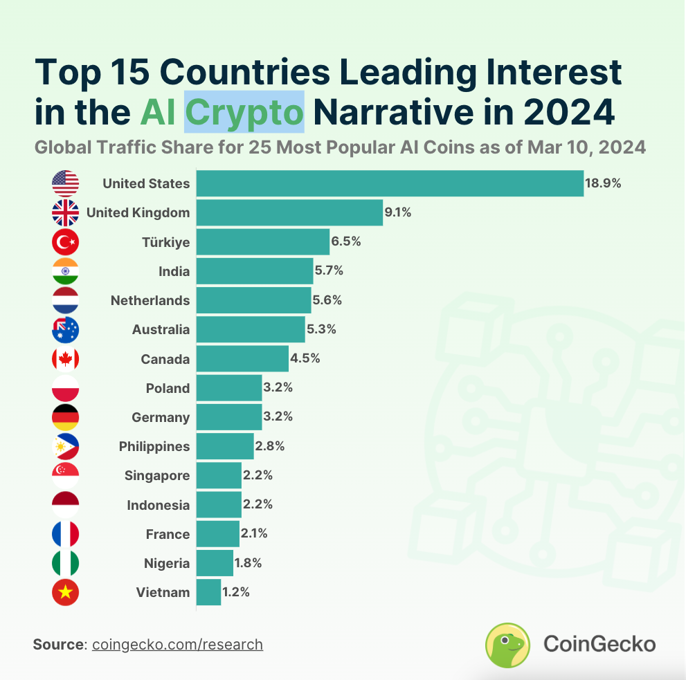 According to CoinGecko's report, among the countries most interested in artificial intelligence-themed cryptocurrencies in 2024 was the USA with a rate of 18.9%, followed by the UK (9.1%) and Turkey (6.5%).