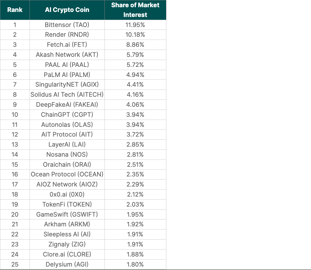 According to the report, Bittensor (TAO), Render (RNDR), and Fetch.ai (FET) have unsurprisingly become the most popular AI cryptocurrencies so far in 2024, thanks to their large market caps and strong price performance.