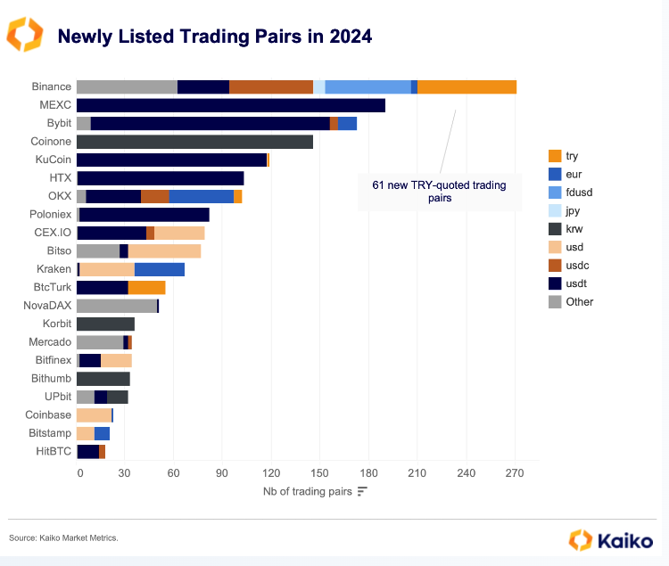 At this point, Binance offers a wide variety of TRY-denominated trading pairs and has been aggressively listing new pairs for the last few years despite the 2022 crypto bear market. In 2024 alone, Binance listed 61 new TRY trading pairs, bringing the total number of TRY trading pairs to over 200.