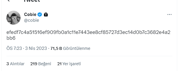 Popular social media phenomenon Cobie, the founder of Uponlytv, made a post about 4 hours ago. It was noticed that this sharing of meaningless numbers and counts was a cryptographic message known as the SHA256 algorithm.