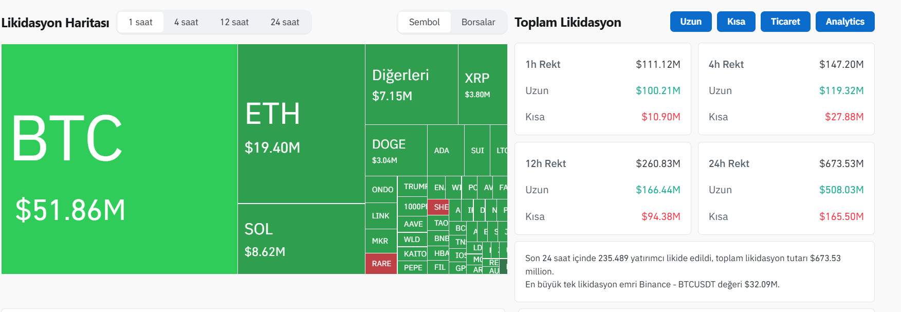 According to Coinglass data, leveraged positions worth $674.2 million were liquidated in the last 24 hours, $508 million of which were long positions and $165.5 million were short positions.