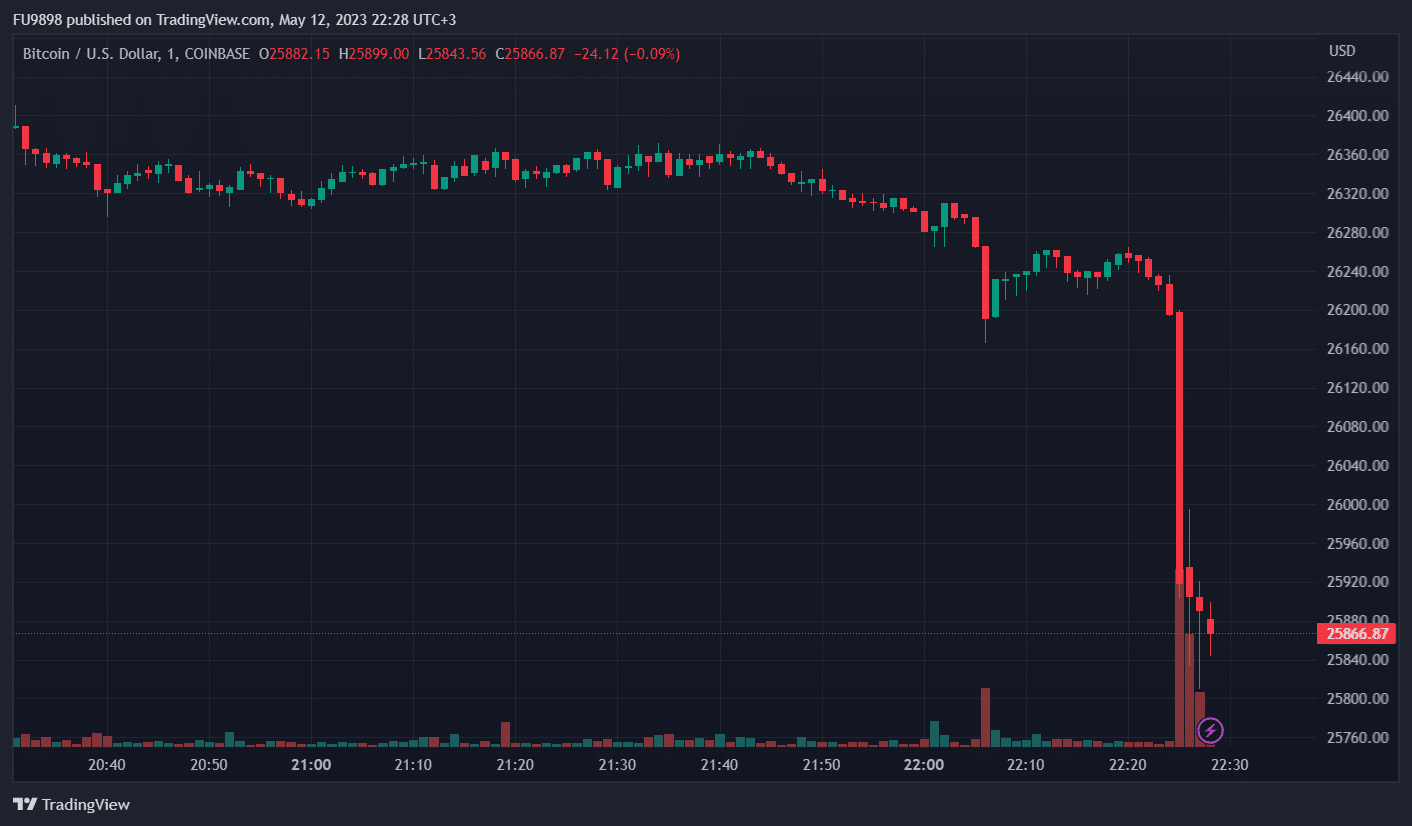 Bitcoin (BTC) price fell 1.5% in a short period of time, dropping from $26,200 to $25,800 minutes ago.