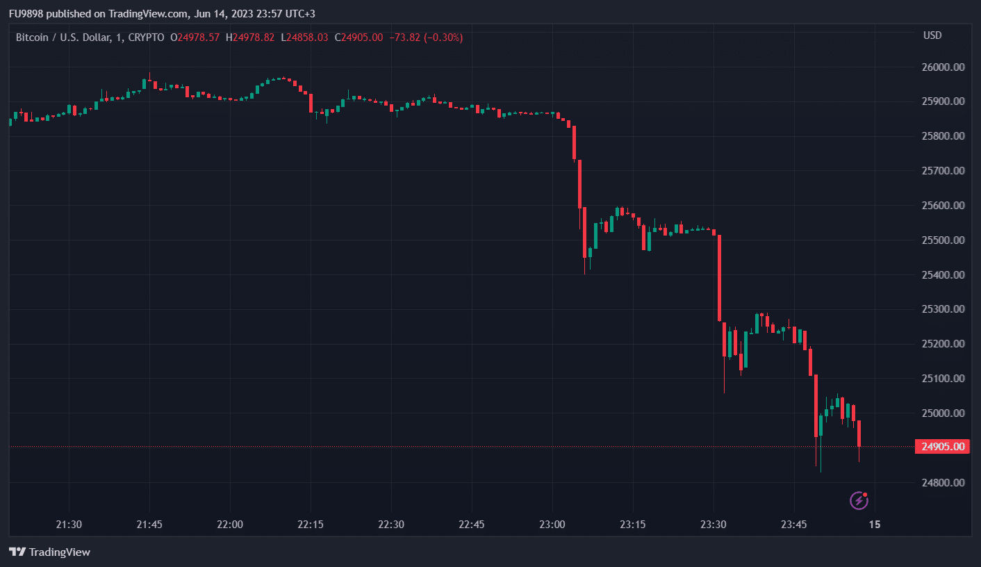 Bitcoin, which exceeded $ 26,000 immediately after the announcement of the interest rate decision, exhibited a strong decline as of 23:00 with the ensuing major regression.