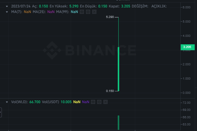 WLD listed on Binance at 12:00 CET rose as high as $5.29 after opening at $0.15. WLD is currently trading at $3.3.